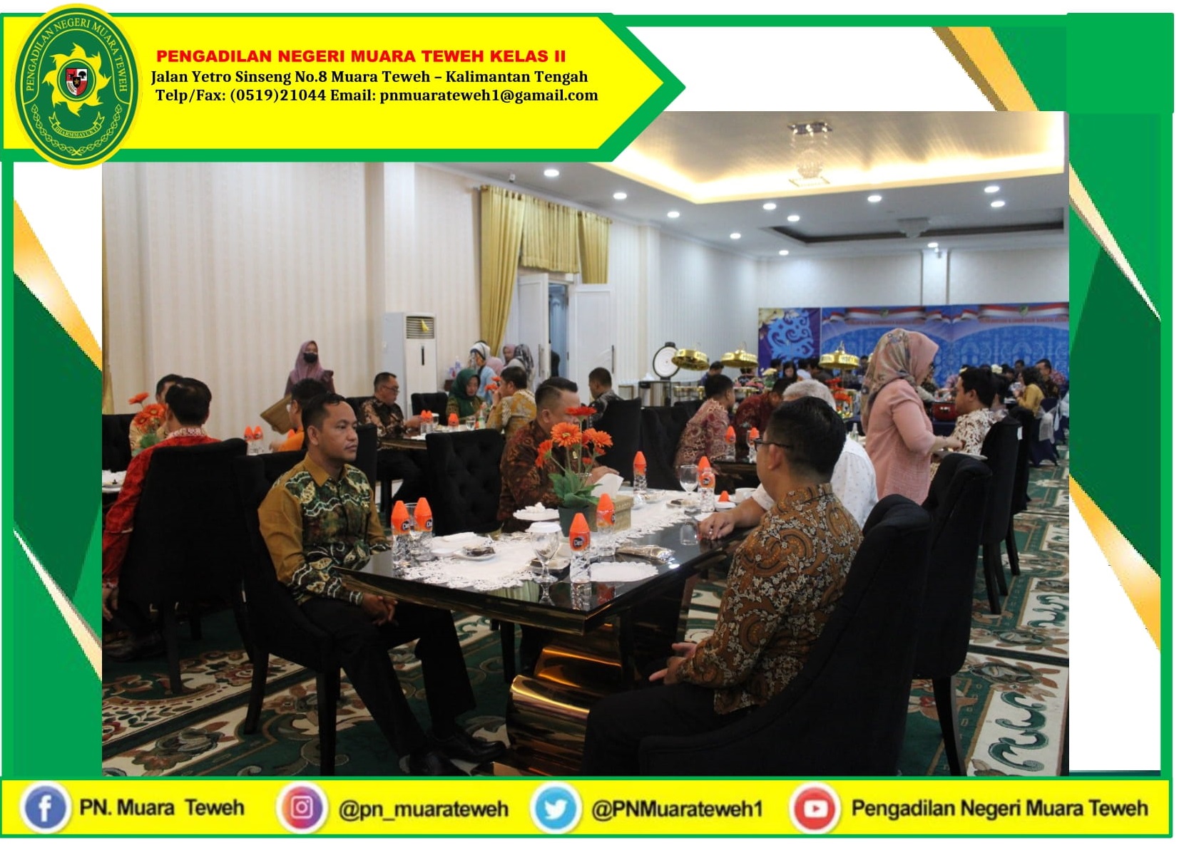 Berkenaan dengan dilaksanakannya Pengawasan dan Pembinaan oleh Ketua Pengadilan Tinggi Palangkaraya di Pengadilan Negeri Muara Teweh, maka Pada hari Selasa, 23 Mei 2023 bertempat di Rumah Jabatan Bupati Barito Utara dilaksanakan Acara Ramah Tamah dan Jamuan Makan yang di hadiri oleh Ketua Pengadilan Tinggi Palangka Raya, Hakim Tinggi Pengawas Daerah, dan Tim, Forkopimda Kabupaten Barito Utara, Hakim, Panitera, Sekretaris, dan Seluruh Pegawai Pengadilan Negeri Muara Teweh Kelas II.